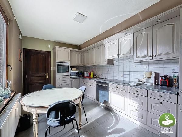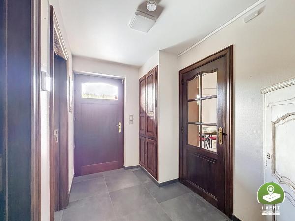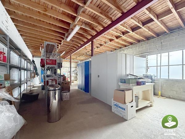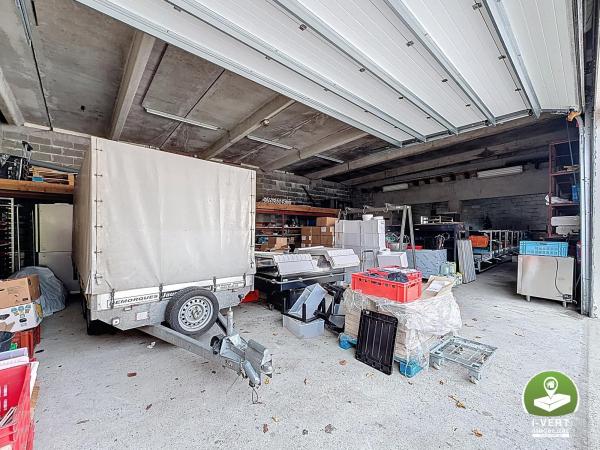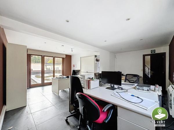 Au rez-de-chaussée: un espace bureau de +/- 115m², un entrepôt de +/- 211m², une piscine, un grand parking avec entrée privative et portail électrique.